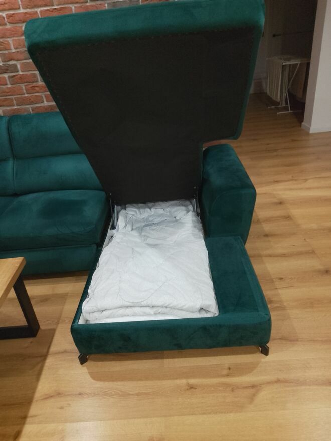 sprzedam praktycznie nową kanapę narożną / narożnik z funkcją do spania o wymiarach 310/210 cm .Kanapa zakupiona w 2025 roku jako nowa, kolor zieleń ,dwa pojemniki na pościel , polecam bo warto, sprzedaję ze względu na przemeblowanie domu .-kanapa bez jakichkolwiek wad i uszkodzeń, kupiona w salonie za 6500,-zł